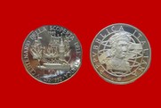 DIRITTO: Ritratto a sinistra, di Cristoforo Colombo e composizione figurativa comprendente l’astrolabio, la rosa dei venti e profili geografici dell’America. Intorno, “REPVBBLICA ITALIANA” e due croci. In basso, il nome dell’autore “COLANERI”.